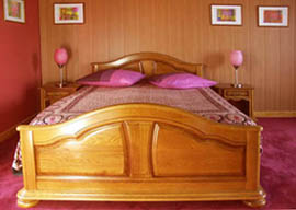 The Red Bedroom: de luxe room sumptuously carpeted throughout, with large oak double bed, sofa, walk-in wardrobe, en suite deluxe W.C./shower-room (power-jet rain-shower) with heated towel rail, towels, shampoo and shower gel provided. Views both to garden at front of house and open country to the rear. Coffee and tea-making facilities. Leather sofa, DVD player.. Wi-fi internet access. | ||||||||||||||||||||||||||||||||||||